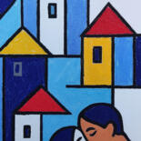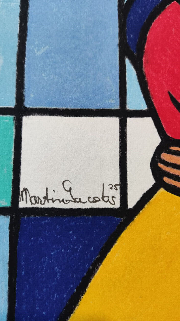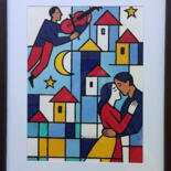 Onderaan omhelzen twee geliefden elkaar. Hun verbondenheid is het middelpunt van mijn werk. In hun aanraking ligt hoop, tederheid en het geloof dat liefde alles overstijgt. De felle kleuren en strakke lijnen versterken dat gevoel: liefde is krachtig, helder en niet te breken.