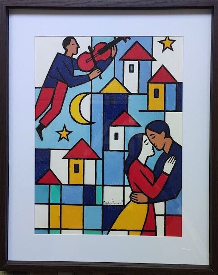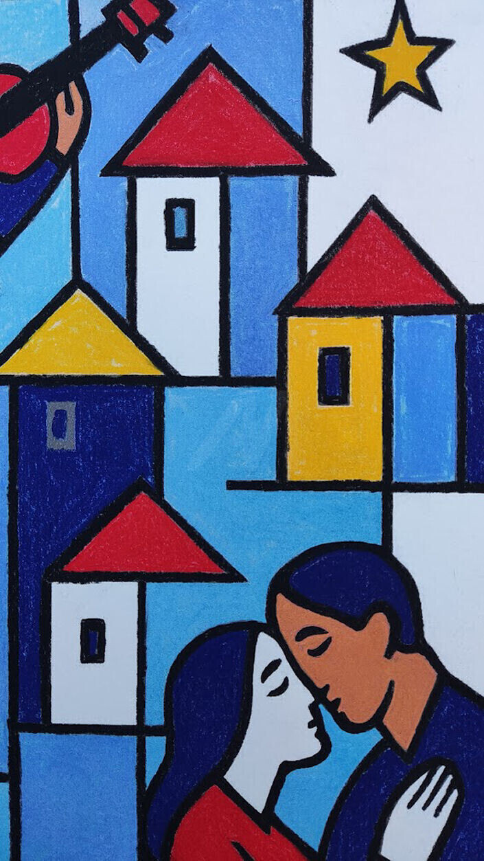 In dit eerste deel heb ik een nachtelijke stad geschilderd, vol kleur en muziek. De violist zweeft boven de daken, zijn melodie raakt de maan en de sterren, alsof hij licht strooit in de duisternis. Hij symboliseert de kracht van kunst en muziek om harten te verbinden, zelfs in tijden van onzekerheid.