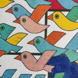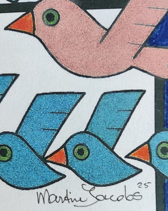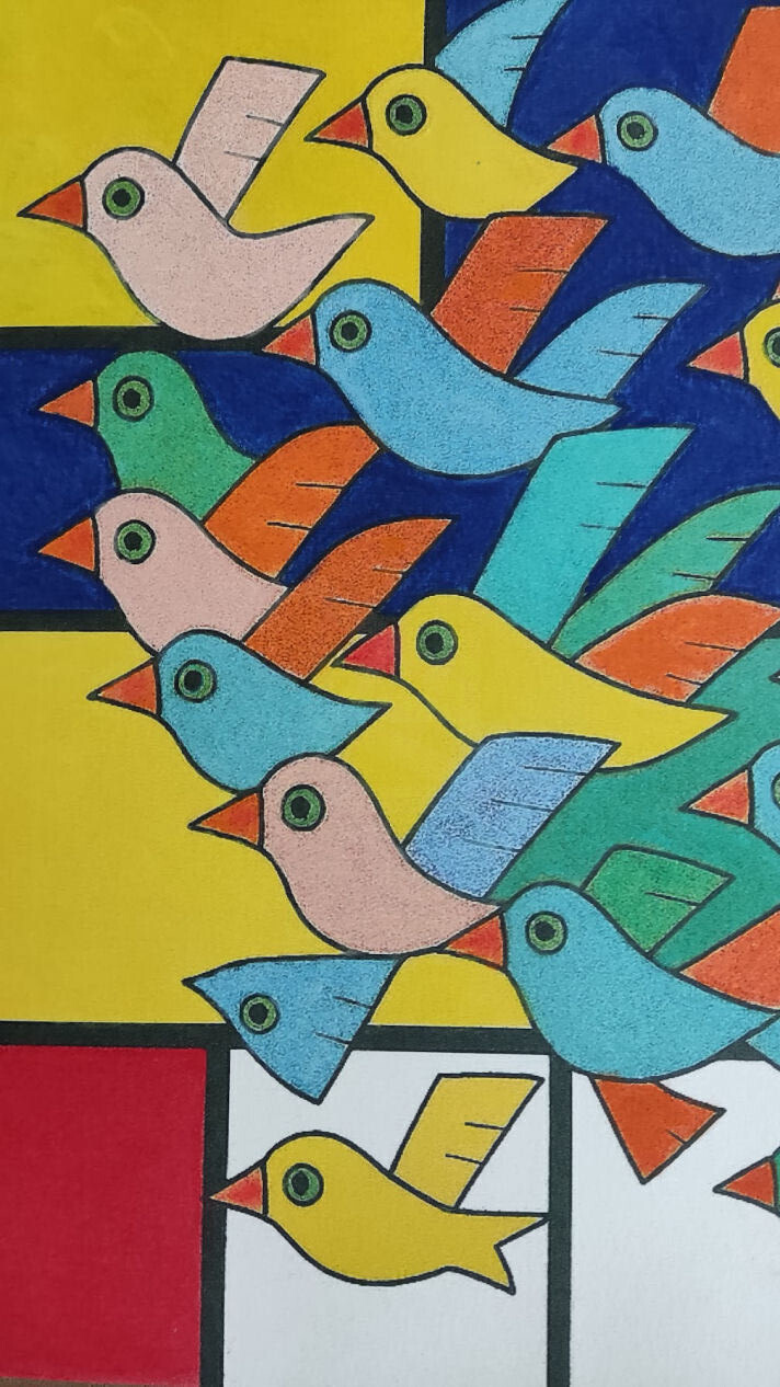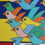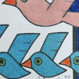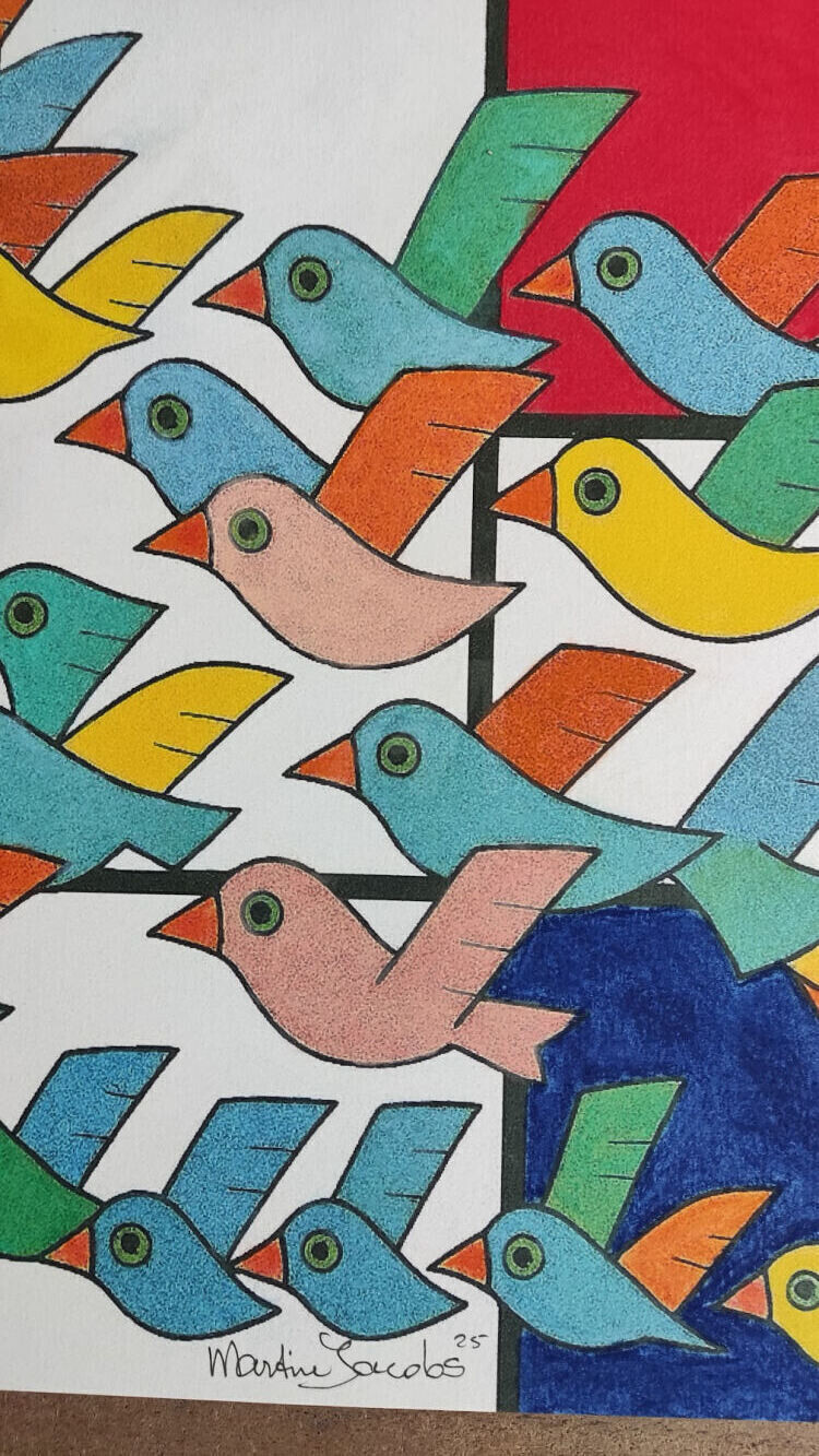In dit werk dansen mijn vogeltjes vrijuit door een wereld van lijnen en vlakken, als kinderen die niets liever doen dan spelen. Hun vleugels zijn licht, hun vormen eenvoudig, maar hun boodschap is helder: het leven is kleur, en spelen is hun taal.